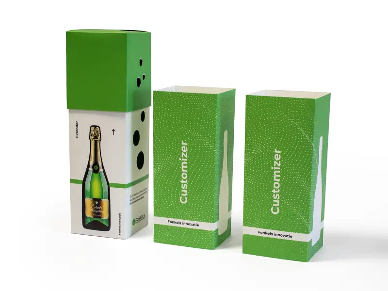 De Extender is een bijzondere kartonnen flesverpakking die opvalt door zijn slimme constructie en verrassende unboxing experience. De bovenzijde van de verpakking is naar boven te schuiven en opent zich dan vervolgens automatisch. De deksel is zelfsluitend wanneer deze omlaag wordt gedrukt. Dit zorgt voor een unieke en speelse open/sluit-ervaring, waarmee de Extender zich duidelijk onderscheidt van andere flesverpakkingen.